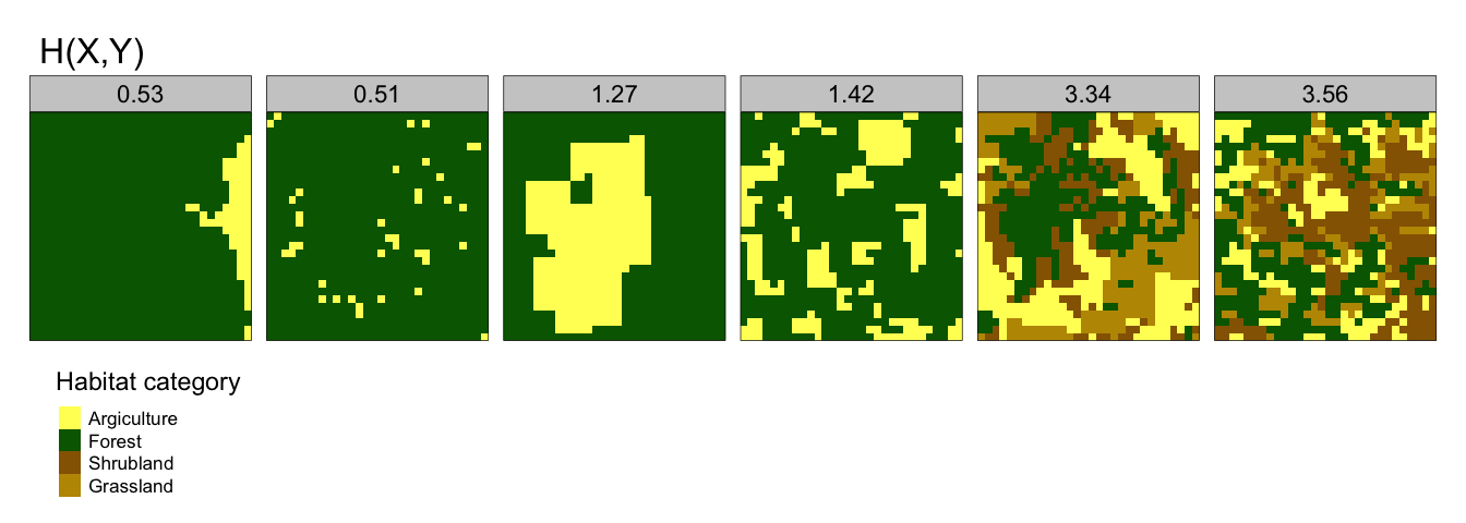- Conditional Entropy, H(Y|X) - quantifies the geometric intricacy of a spatial pattern within a landscape. If habitat type A is predominantly adjacent to habitat type B, H(Y|X) will be relatively low. Conversely if habitat type A is adjacent to many different habitat categories, then H(Y|X) will be relatively high. Figure 2.2 gives some examples of this.